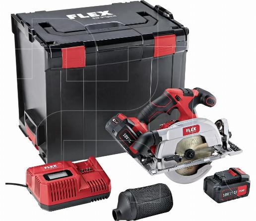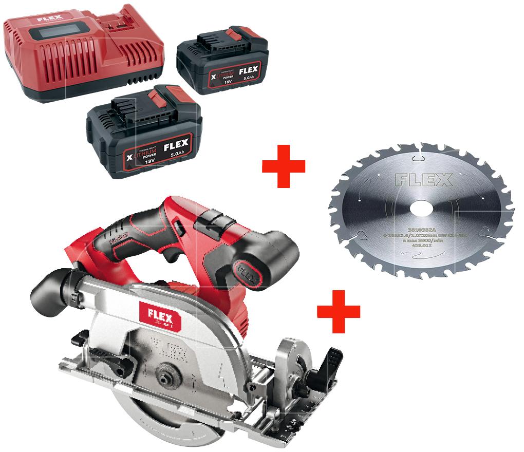 Set met veelzijdige 18V handcirkelzaag met 165 mm zaagblad plus een accu powerset bestaande uit een snellader 12/18 Volt en 2 accupacks 5,0 Ah en standaard cirkelzaagblad met wisselvertanding voor het zijdelings zagen en het zagen van houtsoorten zoals spaander-, OSB- en MDF-platen.