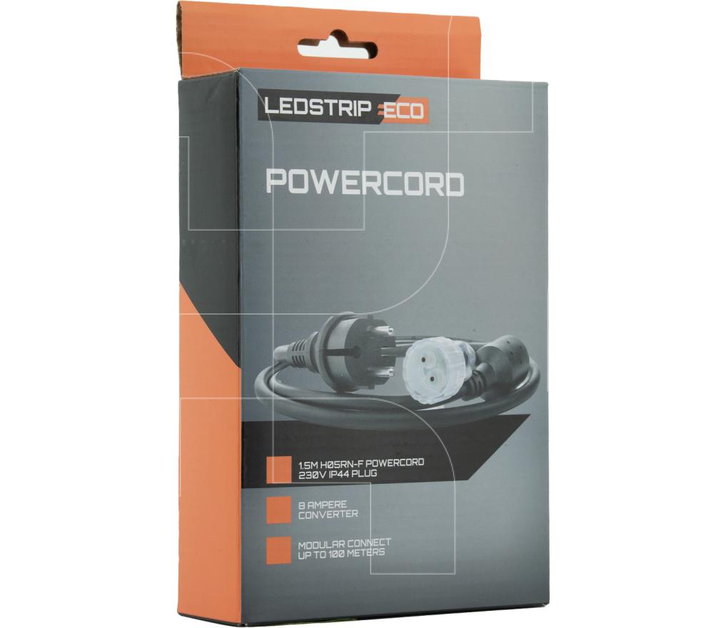 Plug-&-play aansluitkabel om de Ledstrip ECO lichtslangen van 230V te voeden, één powercord voedt een doorgekoppelde installatie tot 100 m.