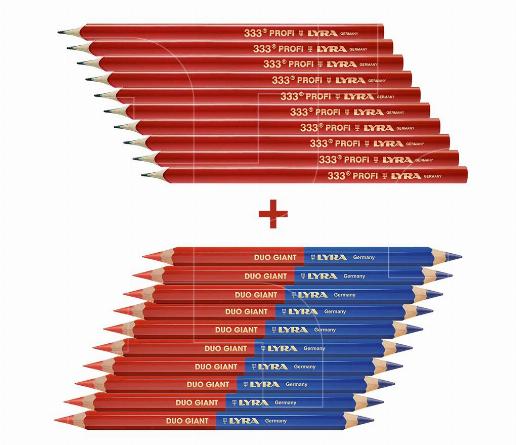 Met dit voordeelpakket haal je 10x LYRA DUO Giant Red/Blue en 10x LYRA Carpenter’s Pencil 333® PROFI in huis, de perfecte combinatie voor vakmensen die gaan voor precisie en duurzaamheid.